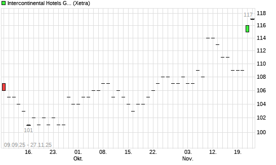 Mit dem Anstieg auf 116,00 EUR hat die InterContinental Hotels Group-Aktie (ISIN GB00BHJYC057) am 26.11.2025 ein neues 6-Monats-Hoch erreicht und damit den Kurs vom 10.11.2025 eingestellt.Die ...weiterlesen