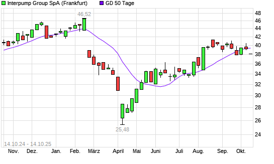Mit dem Rücksetzer auf 38,68 EUR hat die Interpump Group-Aktie am 13.10.2025 die 50-Tage-Linie nach unten gekreuzt.Die Interpump Group-Aktie befindet sich seit dem 07.08.2025 im langfristigen ...weiterlesen