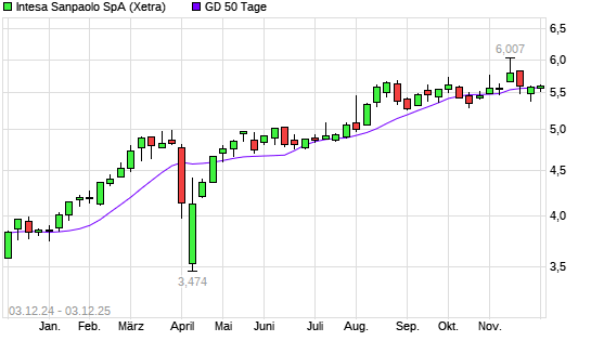 Mit dem Anstieg auf 5,61 EUR hat die Intesa Sanpaolo-Aktie am 02.12.2025 die 50-Tage-Linie nach oben gekreuzt.Die Intesa Sanpaolo-Aktie befindet sich seit dem 08.04.2025 im langfristigen Aufwärtstrend ...weiterlesen