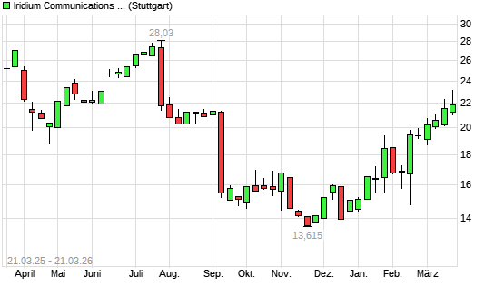 Mit dem Anstieg auf 22,61 EUR hat die Iridium Communications-Aktie (ISIN US46269C1027) am 20.03.2026 ein neues 6-Monats-Hoch erreicht und damit den Kurs vom 18.03.2026 ...weiterlesen