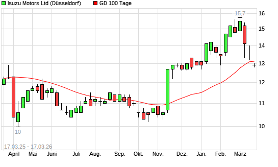 Mit dem Rücksetzer auf 13,00 EUR hat die Isuzu Motors-Aktie am 16.03.2026 die 100-Tage-Linie nach unten gekreuzt.Die Isuzu Motors-Aktie befindet sich seit dem 24.11.2025 ...weiterlesen
