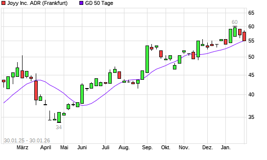 Mit dem Rücksetzer auf 55,50 EUR hat die JOYY-Aktie am 29.01.2026 die 50-Tage-Linie nach unten gekreuzt.Die JOYY-Aktie befindet sich seit dem 05.05.2025 im langfristigen Aufwärtstrend und ...weiterlesen