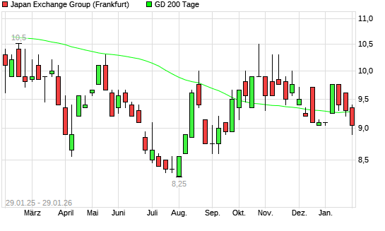 Mit dem Rücksetzer auf 9,25 EUR hat die Japan Exchange Group-Aktie am 28.01.2026 die 200-Tage-Linie nach unten gekreuzt.Die Japan Exchange Group-Aktie befand sich seit dem 23.01.2026 im ...weiterlesen
