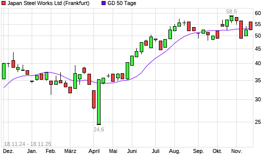 Mit dem Anstieg auf 54,50 EUR hat die Japan Steel Works-Aktie am 17.11.2025 die 50-Tage-Linie nach oben gekreuzt.Die Japan Steel Works-Aktie befindet sich seit dem 10.04.2025 im langfristigen ...weiterlesen