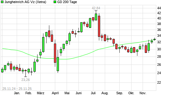 Mit dem Anstieg auf 33,16 EUR hat die Jungheinrich Vz-Aktie am 24.11.2025 die 200-Tage-Linie nach oben gekreuzt.Die Jungheinrich Vz-Aktie befand sich seit dem 26.08.2025 im langfristigen Abwärtstrend ...weiterlesen