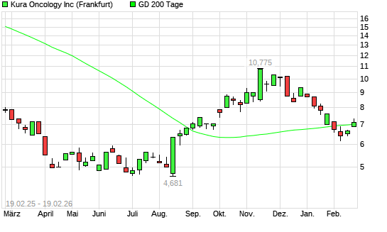 Mit dem Anstieg auf 7,30 EUR hat die KURA ONCOLOGY-Aktie am 18.02.2026 die 200-Tage-Linie nach oben gekreuzt.Die KURA ONCOLOGY-Aktie befand sich seit dem 28.01.2026 im ...weiterlesen