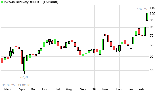 Mit dem Anstieg auf 101,80 EUR hat die Kawasaki Heavy-Aktie (ISIN JP3224200000) am 10.02.2026 ein neues All-Time-High erreicht und damit den Kurs vom 09.02.2026 eingestellt.Die ...weiterlesen