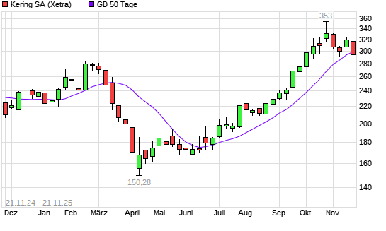 Mit dem Rücksetzer auf 298,20 EUR hat die Kering-Aktie am 20.11.2025 die 50-Tage-Linie nach unten gekreuzt.Die Kering-Aktie befindet sich seit dem 20.08.2025 im langfristigen Aufwärtstrend ...weiterlesen