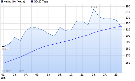 Mit dem Rücksetzer auf 313,95 EUR hat die Kering-Aktie am 30.10.2025 die 20-Tage-Linie nach unten gekreuzt.Die Kering-Aktie befindet sich seit dem 20.08.2025 im langfristigen Aufwärtstrend ...weiterlesen