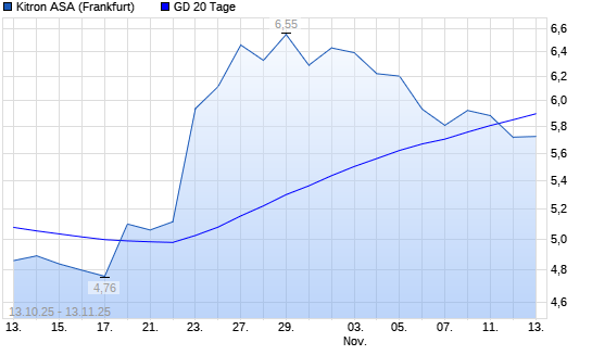 Mit dem Rücksetzer auf 5,81 EUR hat die Kitron ASA-Aktie am 12.11.2025 die 20-Tage-Linie nach unten gekreuzt.Der Abstand zur 200-Tage-Linie beträgt aktuell +21,07%. ...weiterlesen