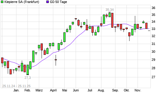 Mit dem Rücksetzer auf 32,76 EUR hat die Klepierre-Aktie am 24.11.2025 die 50-Tage-Linie nach unten gekreuzt.Die Klepierre-Aktie befindet sich seit dem 09.10.2025 im langfristigen Aufwärtstrend ...weiterlesen