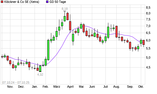 Mit dem Rücksetzer auf 5,74 EUR hat die Klöckner-Aktie am 06.10.2025 die 50-Tage-Linie nach unten gekreuzt.Die Klöckner-Aktie befindet sich seit dem 28.08.2025 im langfristigen Abwärtstrend ...weiterlesen