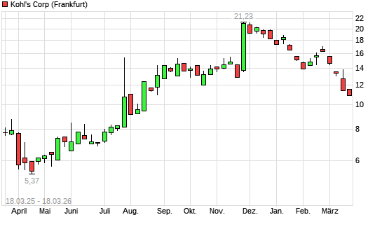 Mit dem Rücksetzer auf 11,14 EUR hat die Kohl's-Aktie (ISIN US5002551043) am 17.03.2026 ein neues 6-Monats-Tief erreicht und damit den Kurs vom 13.03.2026 eingestellt.Die ...weiterlesen
