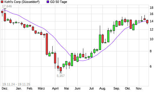 Mit dem Rücksetzer auf 13,44 EUR hat die Kohl's-Aktie am 18.11.2025 die 50-Tage-Linie nach unten gekreuzt.Die Kohl's-Aktie befindet sich seit dem 12.08.2025 im langfristigen Aufwärtstrend ...weiterlesen