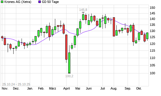 Mit dem Anstieg auf 128,40 EUR hat die Krones-Aktie am 24.10.2025 die 50-Tage-Linie nach oben gekreuzt.Die Krones-Aktie befindet sich seit dem 17.09.2025 im langfristigen Abwärtstrend und hat ...weiterlesen