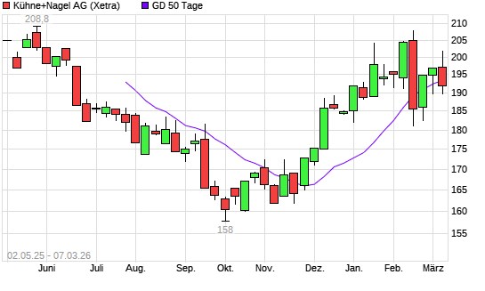 Mit dem Rücksetzer auf 190,15 EUR hat die Kühne + Nagel-Aktie am 06.03.2026 die 50-Tage-Linie nach unten gekreuzt.Die Kühne + Nagel-Aktie befindet sich seit dem 17.02.2026 ...weiterlesen