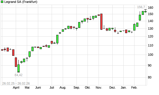 Mit dem Anstieg auf 156,70 EUR hat die Legrand-Aktie (ISIN FR0010307819) am 25.02.2026 ein neues All-Time-High erreicht und damit den Kurs vom 20.02.2026 eingestellt.Die ...weiterlesen