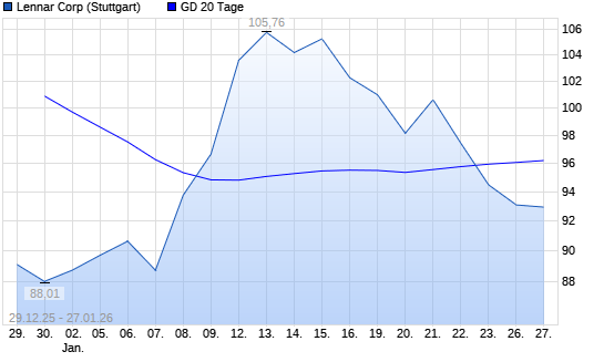 Mit dem Rücksetzer auf 92,15 EUR hat die Lennar-Aktie am 26.01.2026 die 20-Tage-Linie nach unten gekreuzt.Die Lennar-Aktie befindet sich seit dem 20.01.2026 im langfristigen Abwärtstrend ...weiterlesen