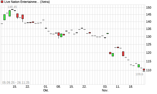 Mit dem Rücksetzer auf 108,35 EUR hat die Live Nation Entertainment-Aktie (ISIN US5380341090) am 25.11.2025 ein neues 6-Monats-Tief erreicht und damit den Kurs vom 21.11.2025 eingestellt.Die ...weiterlesen