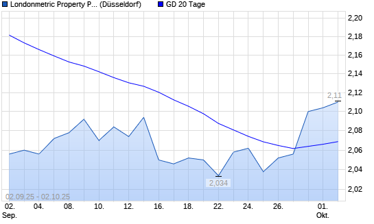 Mit dem Anstieg auf 2,08 EUR hat die Londonmetric Property-Aktie am 01.10.2025 die 20-Tage-Linie nach oben gekreuzt.Die Londonmetric Property-Aktie befindet sich seit dem 14.08.2025 im langfristigen ...weiterlesen