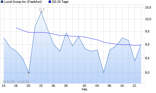 Mit dem Anstieg auf 9,00 EUR hat die Lucid Motors-Aktie am 13.02.2026 die 20-Tage-Linie nach oben gekreuzt.Der Abstand zur 200-Tage-Linie beträgt aktuell -43,94%. ##trendBox## jetzt ...weiterlesen