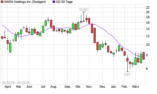 Mit dem Rücksetzer auf 7,33 EUR hat die MARA Holdings-Aktie am 20.03.2026 die 50-Tage-Linie nach unten gekreuzt.Die MARA Holdings-Aktie befindet sich seit dem 11.11.2025 ...weiterlesen