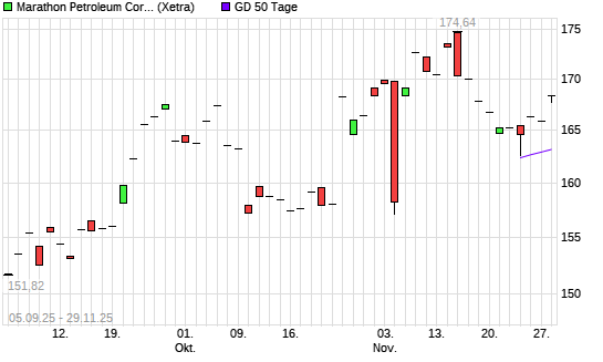 Mit dem Anstieg auf 167,60 EUR hat die Marathon Petroleum-Aktie am 28.11.2025 die 50-Tage-Linie nach oben gekreuzt.Die Marathon Petroleum-Aktie befindet sich seit dem 18.08.2025 im langfristigen ...weiterlesen