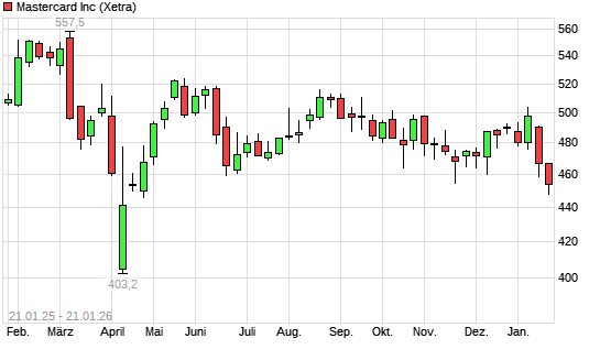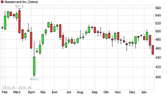 Mit dem Rücksetzer auf 446,55 EUR hat die Mastercard-Aktie (ISIN US57636Q1040) am 22.01.2026 ein neues 6-Monats-Tief erreicht und damit den Kurs vom 20.01.2026 eingestellt.Die Mastercard-Aktie ...weiterlesen