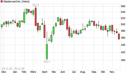 Mit dem Rücksetzer auf 456,75 EUR hat die Mastercard-Aktie (ISIN US57636Q1040) am 19.11.2025 ein neues 6-Monats-Tief erreicht und damit den Kurs vom 18.11.2025 eingestellt.Die Mastercard-Aktie ...weiterlesen