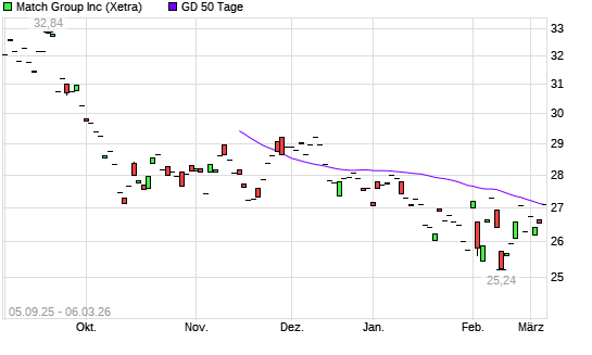Mit dem Rücksetzer auf 25,96 EUR hat die Match Group-Aktie am 05.03.2026 die 50-Tage-Linie nach unten gekreuzt.Die Match Group-Aktie befindet sich seit dem 12.12.2025 im ...weiterlesen