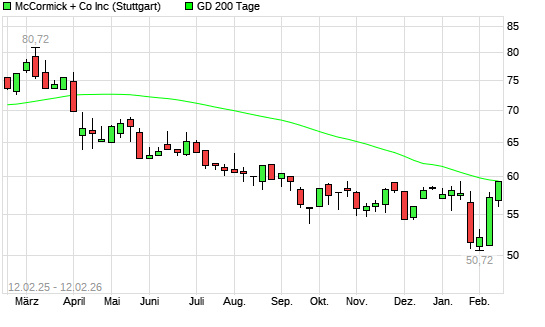 Mit dem Anstieg auf 59,48 EUR hat die McCormick-Aktie am 11.02.2026 die 200-Tage-Linie nach oben gekreuzt.Die McCormick-Aktie befand sich seit dem 04.04.2025 im langfristigen Aufwärtstrend und ...weiterlesen