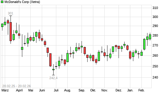 Mit dem Anstieg auf 281,10 EUR hat die McDonald's-Aktie (ISIN US5801351017) am 19.02.2026 ein neues 6-Monats-Hoch erreicht und damit den Kurs vom 13.02.2026 ...weiterlesen