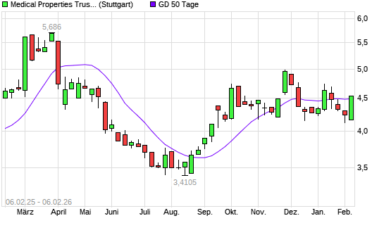 Mit dem Anstieg auf 4,46 EUR hat die Medical Properties Trust-Aktie am 05.02.2026 die 50-Tage-Linie nach oben gekreuzt.Die Medical Properties Trust-Aktie befindet sich seit dem ...weiterlesen
