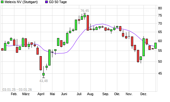 Mit dem Anstieg auf 61,95 EUR hat die Melexis-Aktie am 07.01.2026 die 200-Tage-Linie nach oben gekreuzt.Die Melexis-Aktie befand sich seit dem 08.12.2025 im langfristigen Abwärtstrend und hat ...weiterlesen