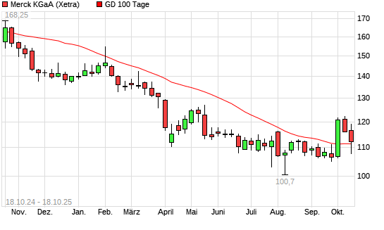 Mit dem Anstieg auf 112,55 EUR hat die Merck-Aktie am 17.10.2025 die 100-Tage-Linie nach oben gekreuzt.Die Merck-Aktie befindet sich seit dem 24.10.2024 im langfristigen Abwärtstrend und hat ...weiterlesen