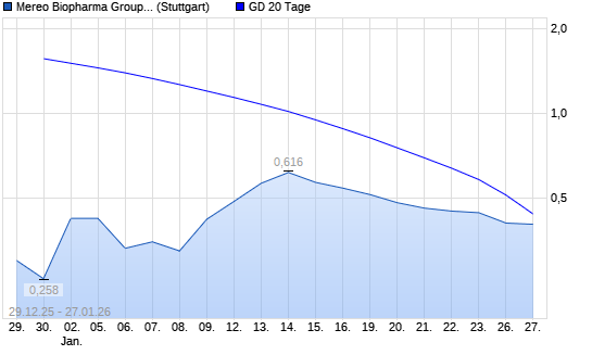 Mit dem Rücksetzer auf 0,41 EUR hat die Mereo Biopharma-Aktie am 26.01.2026 die 20-Tage-Linie nach unten gekreuzt.Die Mereo Biopharma-Aktie befindet sich seit dem 29.12.2025 im langfristigen ...weiterlesen