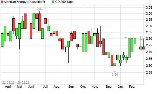 Mit dem Anstieg auf 2,78 EUR hat die Meridian Energy-Aktie am 27.02.2026 die 100-Tage-Linie nach oben gekreuzt.Die Meridian Energy-Aktie befindet sich seit dem 25.02.2026 im ...weiterlesen