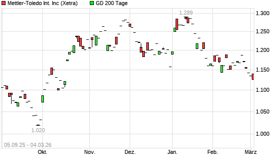 Mit dem Rücksetzer auf 1.129,50 EUR hat die Mettler-Toledo-Aktie am 03.03.2026 die 200-Tage-Linie nach unten gekreuzt.Die Mettler-Toledo-Aktie befand sich seit dem 02.10.2025 ...weiterlesen