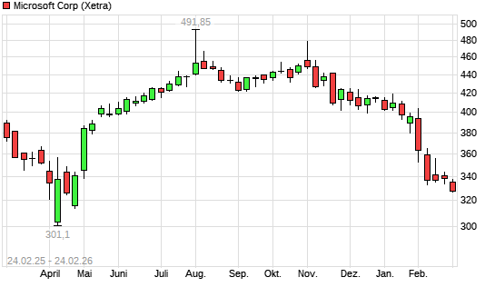 Mit dem Rücksetzer auf 325,40 EUR hat die Microsoft-Aktie (ISIN US5949181045) am 23.02.2026 ein neues 6-Monats-Tief erreicht und damit den Kurs vom 05.02.2026 ...weiterlesen