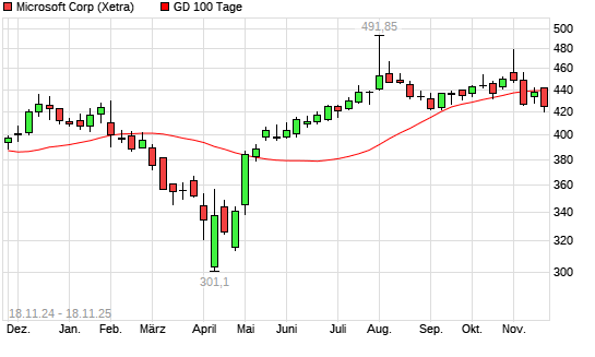 Mit dem Rücksetzer auf 436,40 EUR hat die Microsoft-Aktie am 17.11.2025 die 100-Tage-Linie nach unten gekreuzt.Die Microsoft-Aktie befindet sich seit dem 07.05.2025 im langfristigen Aufwärtstrend ...weiterlesen