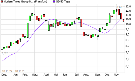 Mit dem Rücksetzer auf 10,51 EUR hat die Modern Times Group B-Aktie am 17.11.2025 die 50-Tage-Linie nach unten gekreuzt.Die Modern Times Group B-Aktie befindet sich seit dem 29.09.2025 ...weiterlesen