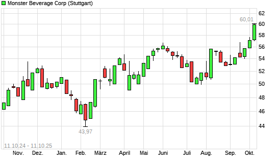 Mit dem Anstieg auf 59,93 EUR hat die Monster Beverage-Aktie (ISIN US61174X1090) am 10.10.2025 ein neues All-Time-High erreicht und damit den Kurs vom 09.10.2025 eingestellt.Die Monster Beverage-Aktie ...weiterlesen