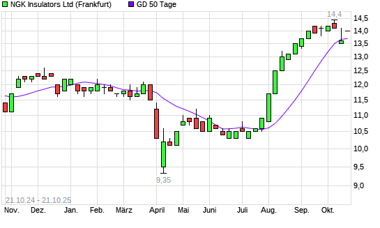Mit dem Anstieg auf 14,00 EUR hat die NGK Insulators-Aktie am 20.10.2025 die 50-Tage-Linie nach oben gekreuzt.Die NGK Insulators-Aktie befindet sich seit dem 01.08.2025 im langfristigen Aufwärtstrend ...weiterlesen