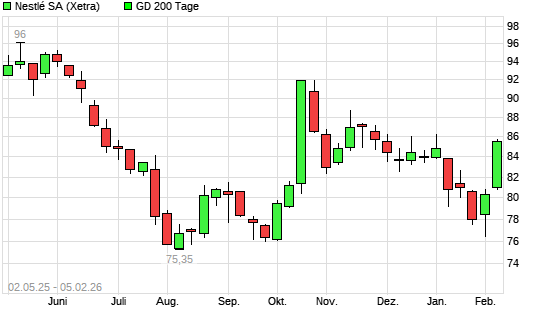 Mit dem Anstieg auf 85,00 EUR hat die Nestlé-Aktie am 04.02.2026 die 200-Tage-Linie nach oben gekreuzt.Die Nestlé-Aktie befand sich seit dem 24.11.2025 im ...weiterlesen