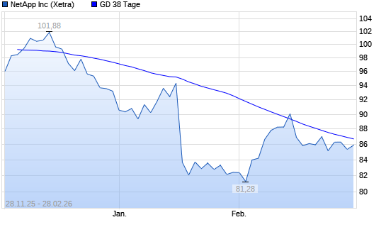 Mit dem Anstieg auf 85,42 EUR hat die NetApp-Aktie am 27.02.2026 die 38-Tage-Linie nach oben gekreuzt.Die NetApp-Aktie befindet sich seit dem 19.01.2026 im langfristigen Abwärtstrend ...weiterlesen