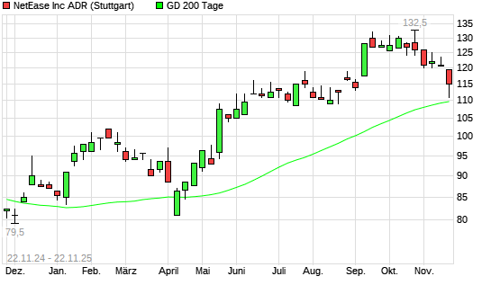 Mit dem Anstieg auf 113,50 EUR hat die NetEase-Aktie am 21.11.2025 die 200-Tage-Linie nach oben gekreuzt.Die NetEase-Aktie befand sich seit dem 20.11.2025 im langfristigen Abwärtstrend und hat ...weiterlesen