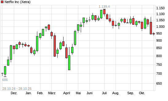 Mit dem Rücksetzer auf 938,30 EUR hat die Netflix-Aktie (ISIN US64110L1061) am 27.10.2025 ein neues 6-Monats-Tief erreicht und damit den Kurs vom 24.10.2025 eingestellt.Die Netflix-Aktie ...weiterlesen