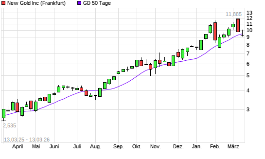 Mit dem Rücksetzer auf 9,34 EUR hat die New Gold-Aktie am 12.03.2026 die 50-Tage-Linie nach unten gekreuzt.Der Abstand zur 200-Tage-Linie beträgt aktuell +45,45%. Die ...weiterlesen