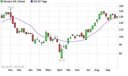 Mit dem Anstieg auf 131,40 EUR hat die Nexans-Aktie am 03.10.2025 die 50-Tage-Linie nach oben gekreuzt.Die Nexans-Aktie befindet sich seit dem 30.06.2025 im langfristigen Aufwärtstrend und hat ...weiterlesen