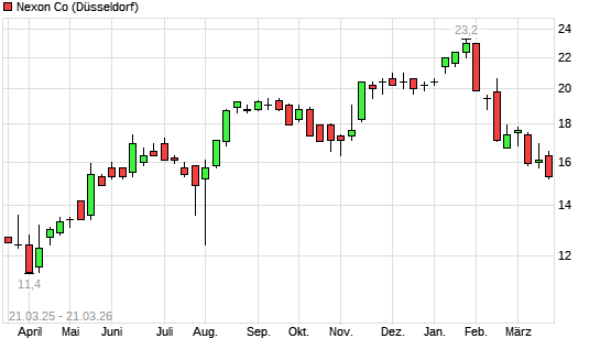Mit dem Rücksetzer auf 15,40 EUR hat die Nexon-Aktie (ISIN JP3758190007) am 20.03.2026 ein neues 6-Monats-Tief erreicht und damit den Kurs vom 19.03.2026 eingestellt.Die ...weiterlesen